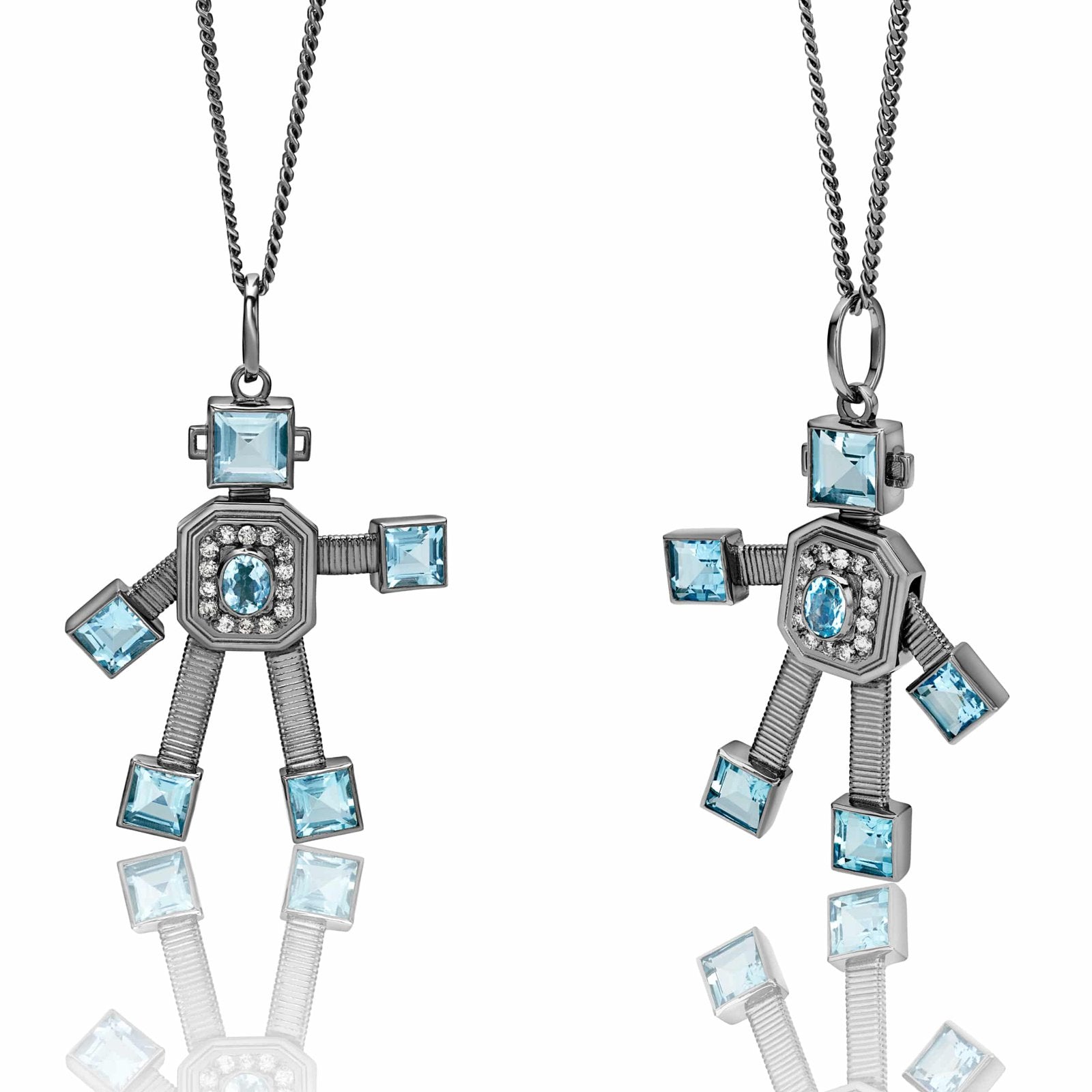 Fine jewellery Van Robot maxi articulated pendant handcrafted in Italy with Diamond, Aquamarine, 18kt Blackened Gold. Loop size allows pendant to be worn on multiple chains at all heights