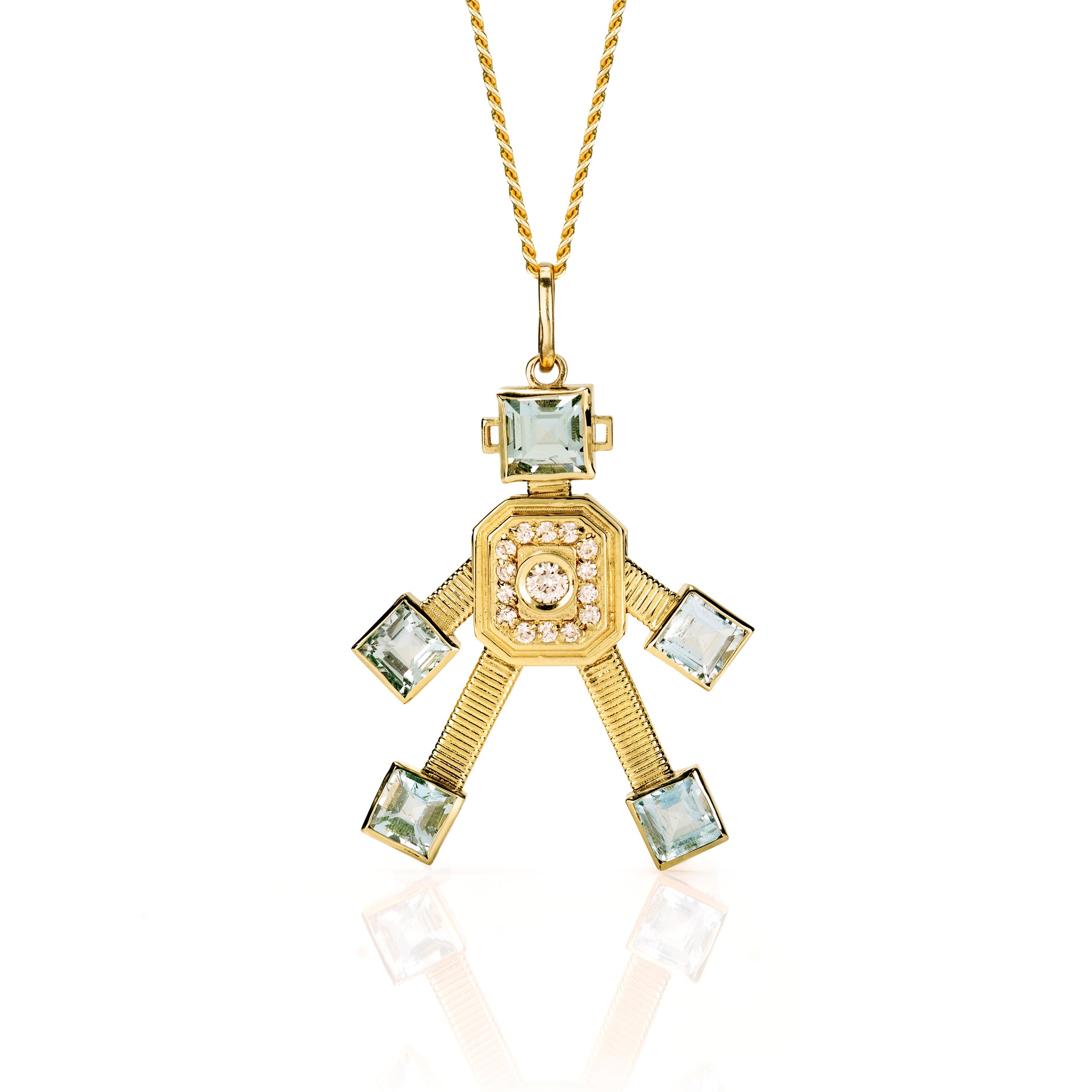 Fine jewellery Van Robot midi articulated pendant handcrafted in Italy with Diamond, Aquamarine, 18kt Gold. Loop size allows pendant to be worn on multiple chains at all heights.