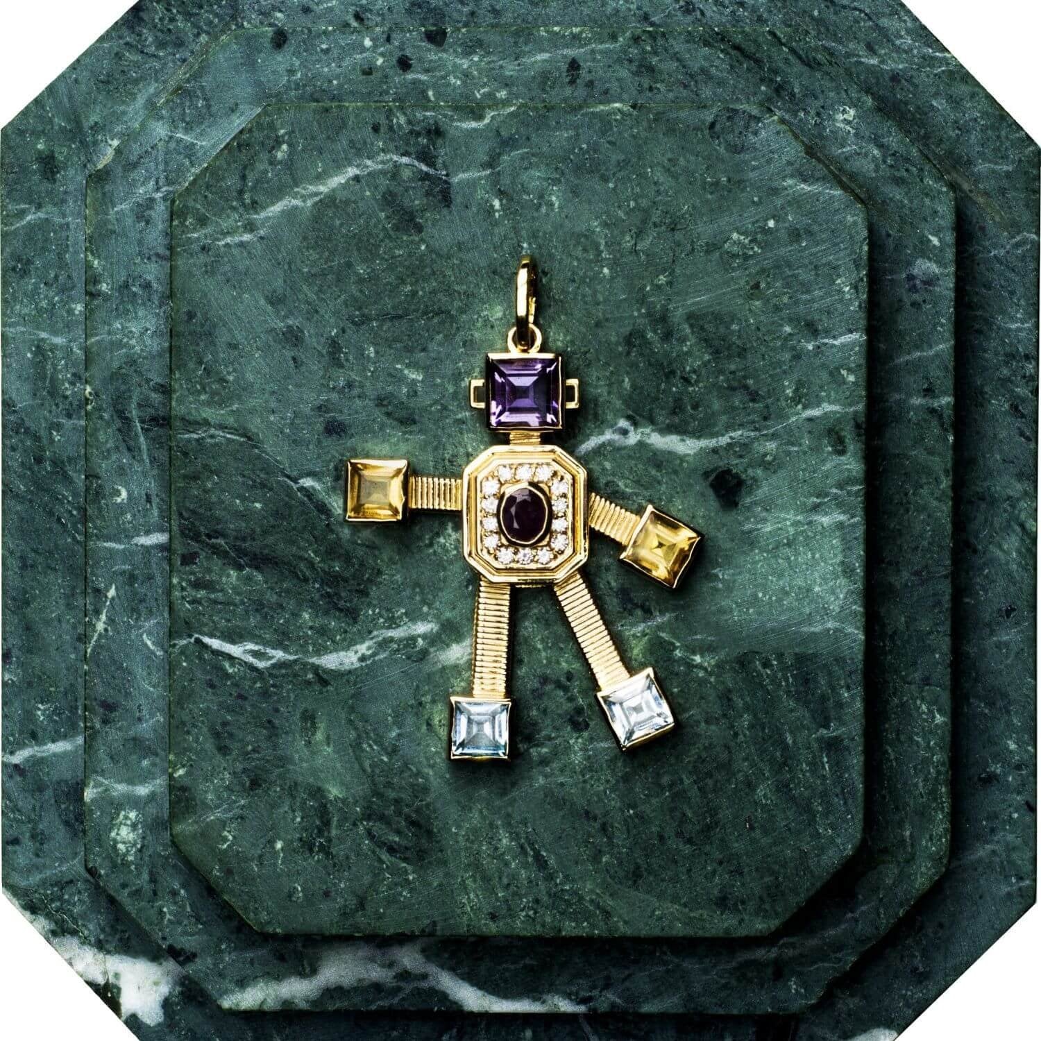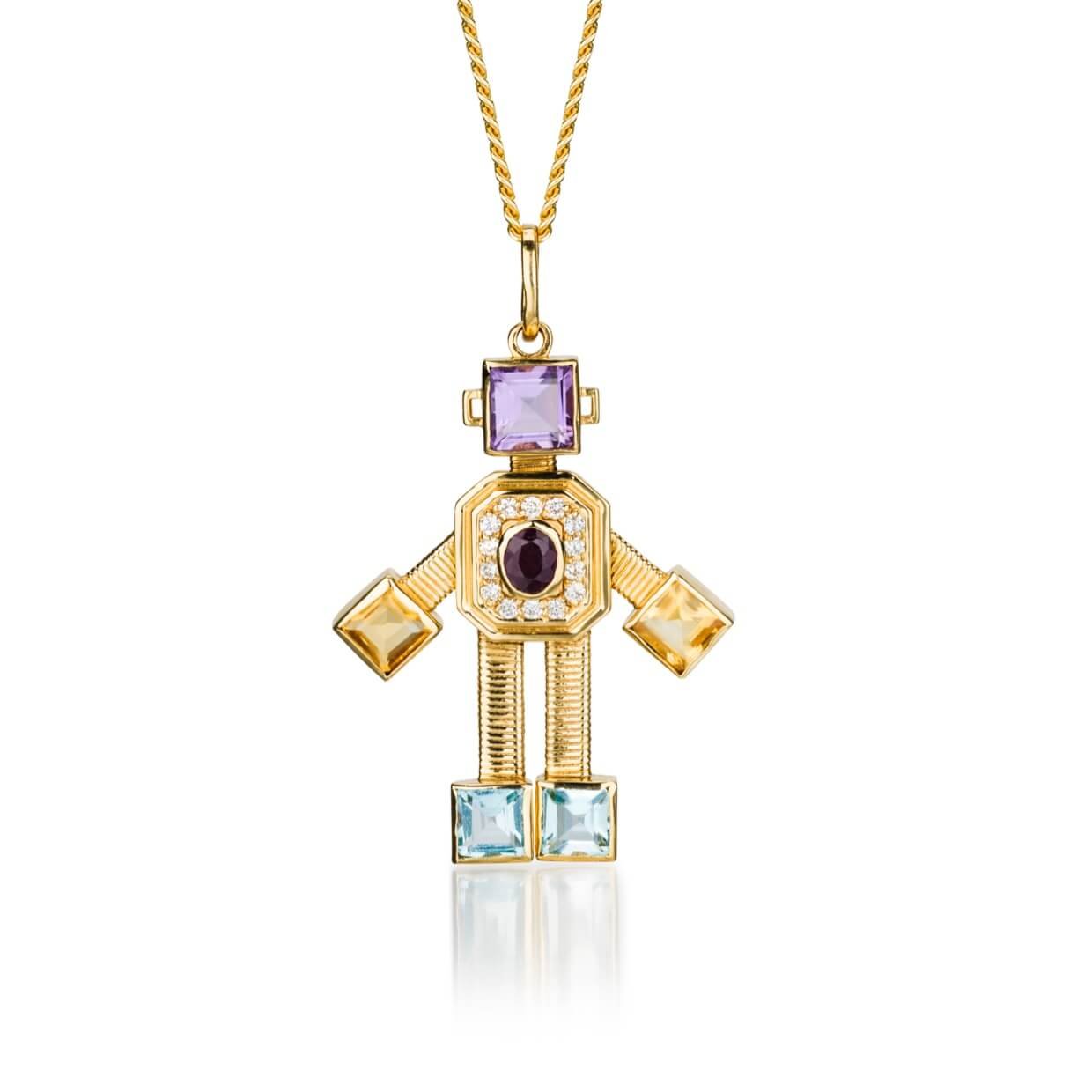 Fine jewellery Van Robot maxi articulated pendant handcrafted in Italy with Diamond, Ruby, Amethyst, Citrine, Swiss Blue Topaz, 18kt Gold. Loop size allows pendant to be worn on multiple chains at all heights.