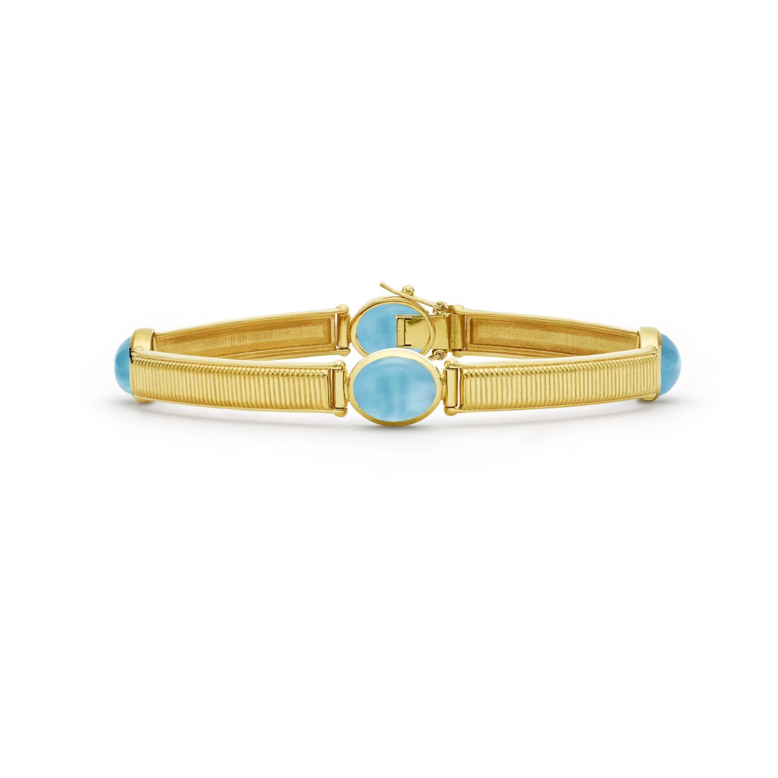 Fine jewellery bracelet handmade in Italy with 18kt Gold and cabochon Aquamarine Power Stones believed to foster wisdom. See Stone Properties for more details. Available in two lengths.