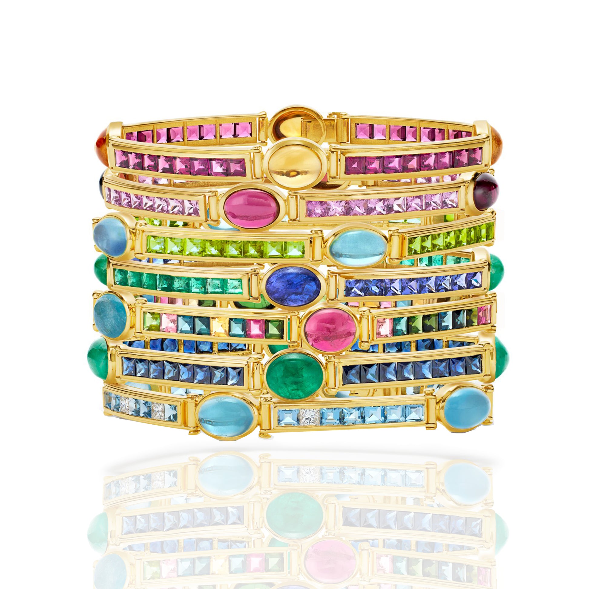 - Rio: Multi-colour Tourmaline: 1 cabochon Blue Tourmaline 0.80ct, 1 cabochon Rubylitte Tourmaline, 0.80ct 1 cabochon Yellow Tourmaline, 0.45ct 1 cabochon Fire Green Tourmaline, 60ct 32 square Multicolour Tourmalines 78.75ct