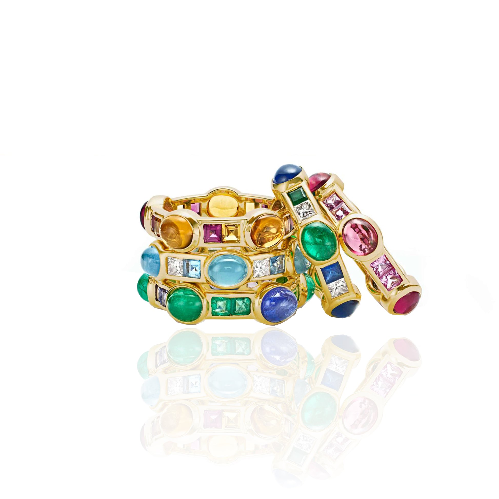 - Rio: Multi-colour Tourmaline: 1 cabochon Blue Tourmaline 0.75ct, 1 cabochon Rubylitte Tourmaline 0.66ct, 1 cabochon Green Tourmaline 0.68ct, 1 cabochon Yellow Tourmaline 0.80ct, 10 square Multicolour Tourmalines 1.30ct